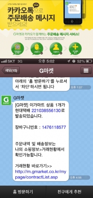 이번 서비스는 지마켓 고객이 원하는 쇼핑정보와 주문배송관련 메시지를 기존 SMS가 아닌 카톡 내 지마켓 플러스 친구를 통해 받아볼 수 있는 것으로, 주문 결과에 대한 링크도 함께 전달돼 모바일 웹에서 본인의 주문 및 배송 상태를 바로 확인할 수 있다.