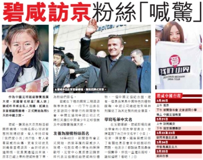 이날 베컴은 교류 프로그램에서 학생에게 서예를 배워 자신의 중국어 이름을 써서 큰 박수를 받기도 했다.