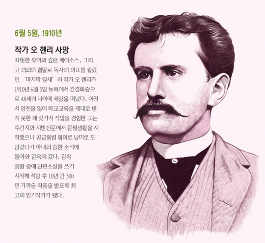 따뜻한 유머와 깊은 페이소스, 그리고 의외의 결말로 독자의 의표를 찔렀던 ‘마지막 잎새’의 작가 오 헨리가 1910년 6월 5일 뉴욕에서 간경화증으로 48세의 나이에 세상을 떠났다. 어려서 양친을 잃어 학교교육을 제대로 받지 못한 채 갖가지 직업을 경험한 그는 주간지와 지방신문에서 문필생활을 시작했으나 공금횡령 혐의로 남미로 도망갔다가 아내의 중환 소식에 돌아와 감옥에 갔다. 감옥생활 중에 단편소설을 쓰기 시작해 석방 후 10년 간 300편 가까운 작품을 발표해 최고의 인기작가가 됐다