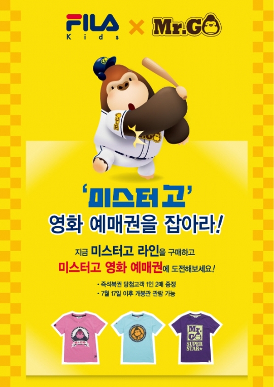 휠라 키즈는 미스터 고 컬렉션 출시를 기념해 오는 30일까지 구매 고객 250명과 SNS 응모를 통한 50명 등 총 300명을 추첨해 '미스터 고' 영화 예매권을 1인 2매씩 증정한다. 문의: www.fila.com