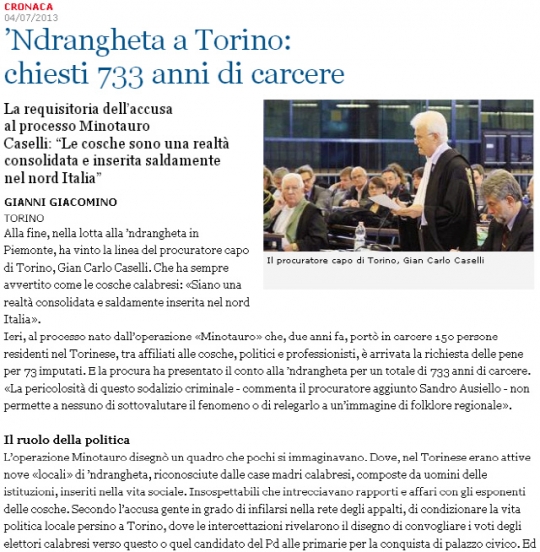 이탈리아 현지신문 라스탐파에 따르면 3일(현지시간) 이탈리아 토리노 쟌 카를로 카셀리 검사팀이 피에몬테 마피아 조직 은드란게따('ndrangheta) 조직원 73명을 기소, 총 733년에 달하는 징역을 구형한 끝에 승소했다. 이는 마피아 수사 프로젝트 '미노타우로'를 마무리 지은 사건으로 지난 20년간 피에몬테의 범죄조직에게 내린 형량 중 최고 기록이다.