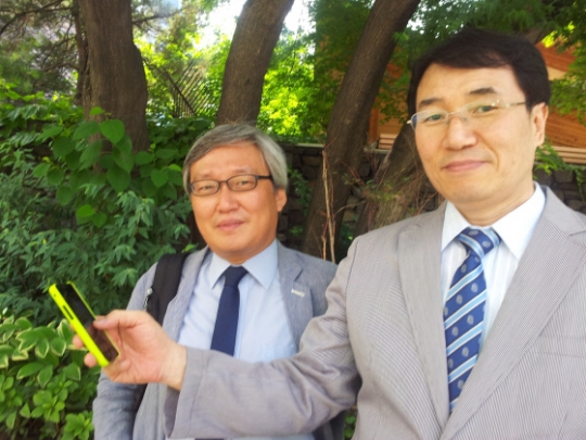 ▲ 앱 '하날글'을 공동 개발한 서울대 노희명 교수(왼쪽)와 TP-i 박태운 대표가 하날글을 시연해보이고 있다.