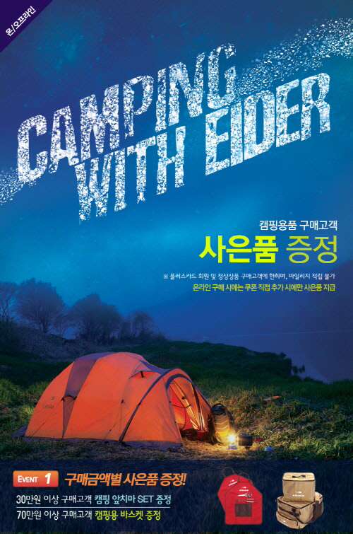 아이더는 온라인 쇼핑몰(www.eider.co.kr)과 전국 매장에서 30만원 이상을 구입한 고객에게 집게·가위·앞치마로 구성한 캠핑용 앞치마 세트를 증정한다.