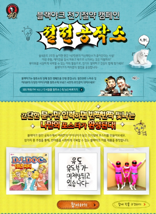 이달 말까지 SBS 라디오 파워 FM '두시탈출 컬투쇼' 홈페이지(radio.sbs.co.kr/cultwoshow)에 '나만의 절전 아이디어'를 사연을 보내 채택된 고객에게는 블랙야크 그늘막텐트와 쿨스카프 등을 증정한다.