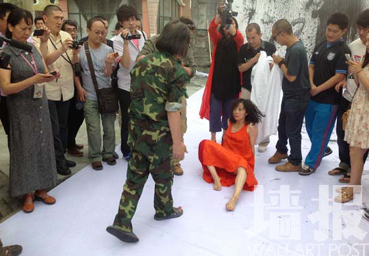 그는 이번 공연에서 두 명의 남성의 성추행을 당했다. 먼저 송좡(宋庄) 예술구의 시인 허루(何路)는 공연 도중 성추행을 하며 그에게 강제로 입을 맞췄다. 또 다른 사람은 역시 송좡의 예술가 청리(成力) 역시 그의 공연에 ‘참여’하려 했다.