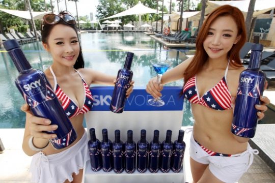 미국의 프리미엄 보드카인 스카이보드카가 13일 서울 장충동 반얀트리 수영장에서 미국 수영복 브랜드 엘 스페이스와 컬래보레이션으로 진행한 '스카이보드카 아메리칸 뷰티 리미티드 에디션' 출시 행사를 가졌다. 독특한 별 문양과 레드·화이트 줄무늬로 된 비키니가 병에 디자인돼 있는 것이 특징이다. /전효순기자