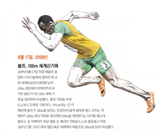 2009년 8월 17일 독일 베를린 올림픽스타디움에서 벌어진 제 12회 세계육상선수권대회 남자 100m 결선에서 자메이카의 우사인 볼트가 9초 58로 세계 기록을 경신하며 우승했다. 종전 기록을 무려 0.11초나 단축한 기록이다. 원래 육상 지도자들은 볼트의 주 종목을 200m와 400m로만 판단했다. 195cm라는 큰 키 때문이었다. 일반적으로 볼트가 단거리의 새로운 제왕으로 등극하기 전까지는 100m에서 최적의 키는 185cm이하로 통했다. 볼트가 100m를 달리는 걸 탐탁지 않게 생각한 밀스 코치는 자메이카 200m 최고기록을 경신하면 100를 허락한다는 내기를 했는데 볼트는 곧 자메이카 육상 영웅 돈 퀘리의 기록을 0.11초 앞당겼고 이후 2007년 7월 그리스에서 열린 육상 대회에서 처음으로 100m를 달려 우승했다.