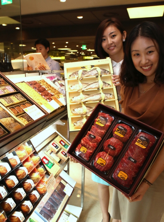 현대백화점은 9월 1일까지 정육·청과·생선·건강식품 등 주요 선물세트 100여 품목을 5~50% 할인 판매한다. 특히 10만원대 실속형 선물세트 물량을 지난해보다 30% 늘렸다.