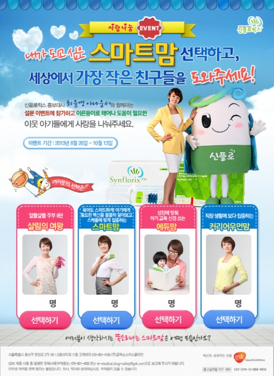 4가지의 맘 스타일은 ▲알뜰살뜰 주부 9단 '살림의 여왕' ▲아기 건강을 똑똑하게 챙기는 '스마트맘' ▲성장 단계별 교육을 잘 챙기는 '에듀맘' ▲직장 생활도 놓치지 않는 '커리어우먼맘' 등으로 신플로릭스의 홍보대사 최윤영 전 아나운서가 각각의 맘 스타일로 변신해 표현했다. 신플로릭스 홈페이지(synflorix.kr)와 GSK의 공식 페이스북 페이지(facebook.com/rixangels)에서 진행된다.