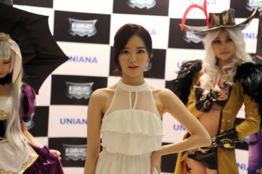 얼짱 출신 가수 고두림(가운데)이 11일 열린 MORPG 라프 출시 설명회에서 인사말을 하고 있다.