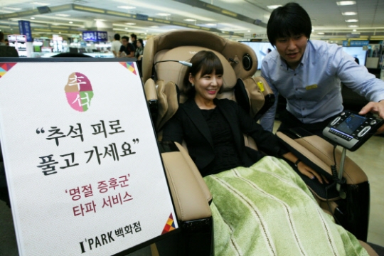 아이파크백화점은 24일까지 '명절 증후군 퇴치 서비스'를 선보인다. 화장품브랜드 닥터자르트 매장에서 손과 얼굴 마사지를, 비디비치 매장에서는 무료 메이크업(예약 고객)을 해준다. 리빙관 토쿠요 매장에서는 안마 의자 마사지 서비스로 지친 몸을 달래준다.