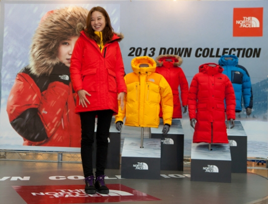 노스페이스가 지난 11일 영등포 타임스퀘어에서 2013년 겨울 시즌 노스페이스 다운 신상품 출시를 기념해 배우 공효진의 팬사인회를 진행했다. 공효진이 팬사인회를 갖기에 앞서 다운 신상품인 '카라 코트'를 입고 포즈를 취하고 있다. '태양의 다운'이라는 이름으로 유명해지고 있는 카라 코트는 트렌디한 레드 컬러에 내구성과 방풍·발수 기능이 더해진 것이 특징이다. /노스페이스 제공