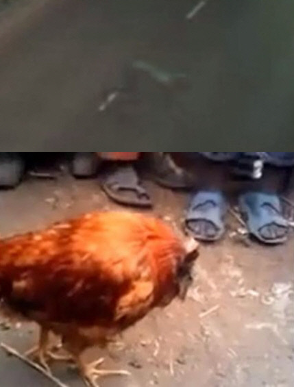 머리 없는 닭이 여기저기 길을 걸어다니고 주변에는 신기한 장면을 보려는 아이들이 몰려 있다. 아이들은 놀란 표정으로 닭을 보면서 사진을 찍기도 한다.