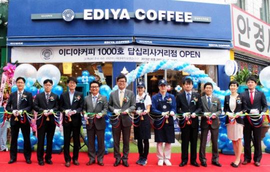 ▲ 이디야커피는 29일 국내 커피 전문점 중에서는 처음으로 1천 번째 점포를 오픈, 관계자들이 테이프 커팅을 하고 있다. /이디야커피 제공