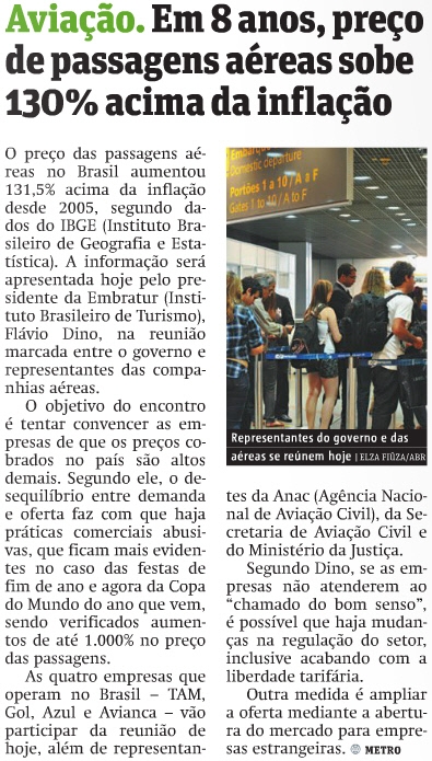 브라질 여행사 협회장 플라비우 지누는 정부인사와 항공사 대표들이 모인 자리에서 "수요와 공급이 불균형 상태에 있다고 해서 부당한 이득을 취하려 해선 안 된다"며 너무 높아지는 항공권 가격에 대해 인상을 자제할 것을 부탁했다. 그는 특히 "연말과 월드컵을 앞두고 항공권 가격이 천정부지로 치솟고 있다"며 강한 우려를 드러냈다. 실제로 특정 구간의 경우 최대 10배까지 비싸진 것으로 나타나 그의 말이 기우가 아닌 것을 증명했다. 그는 국내선을 담당하는 네 개의 항공사가 이번 '부드러운 조치'에 응하지 않을 경우 항공산업의 요금 규정에 변화가 있을 수 있으며 이는 곧 회사 전체의 피해로 이어질 것이라며 경고했다.