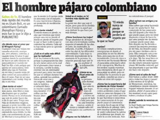 익스트림 스포츠인 '윙수트 플라잉' 선수로 활동 중인 조나단 플로레스. '날다람쥐 복장'으로 하늘을 나는 플로레스의 이야기를 1일(현지시간) 메트로 콜롬비아 보고타가 들어봤다.