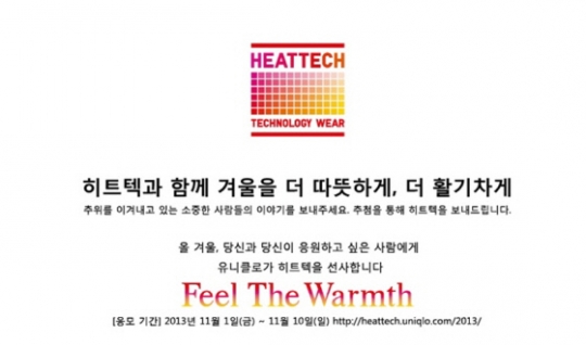 캠페인 웹사이트(heattech.uniqlo.com/2013/kr)에 접속해 따뜻함을 선물하고 싶은 사람 또는 자기 자신에게 히트텍이 필요한 이유에 대해 사연을 올리면 추첨을 통해 히트텍 교환권을 선물로 준다. 교환권은 전국 유니클로 매장에서 사용할 수 있으며, 당첨자는 4일부터 20일까지 순차적으로 발표한다.