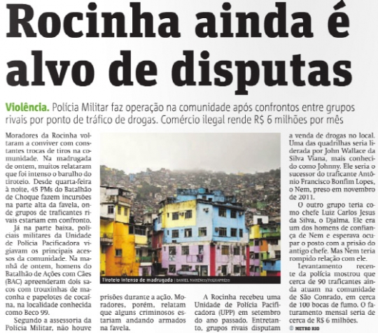 히우 지 자네이루에 위치한 악명 높은 빈민촌 호싱야의 주민들은 시끄러운 총성에 새벽을 불안에 떨며 지새워야 했다. 호싱야는 작년 9월 평화유지 경찰의 관할 아래 평화를 유지했으나 최근 존 왈라시의 조직과 루이스 카를루스 제주스 다 시우바의 조직이 마약의 판매 구역을 놓고 분쟁을 벌이며 다시 전쟁터로 변한 것으로 알려졌다.