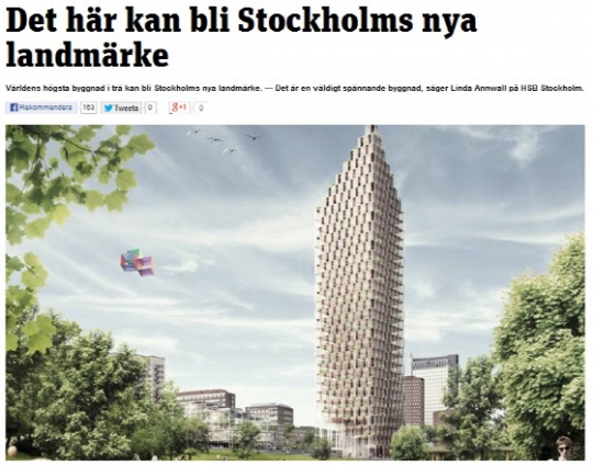 스웨덴 주택 협동조합 HSB가 주최한 건축 경연대회에서 34층 높이의 목조 건물이 대상작으로 선정됐다. 심사위원들은 특히 나무로 지어졌기 때문에 친환경적 건축이라며 찬사를 보냈다. 이번 작품은 두 건축 설계 업체 Berg CF M ller Architects와 Dinelljohansoson의 합작품이다.