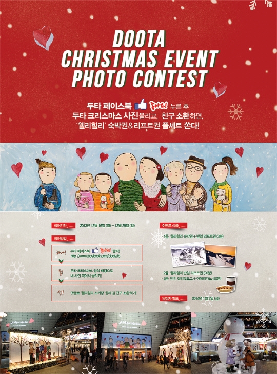 두타 광장 크리스마스 장식물을 배경으로 사진을 찍어 두타 페이스북에 올리면 추첨을 통해 웰리힐리 숙박권과 리프트권, 핫도그&커피 세트를 증정한다.