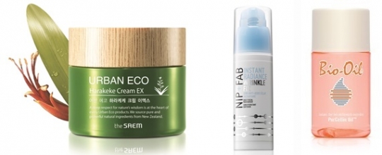 더샘 '어반 에코 하라케케 크림 EX', 스킨알엑스 '닙앤팹 인스턴트 래디언스 모이스처라이저 by SKINRx', 유한양행 '바이오-오일'.