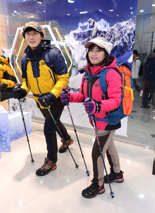 20일 서울 성수동 K2본사 매장에서 사내 모델들이 디터처블 재킷 출시를 기념해 '눈꽃산행 추천 아이템'을 선보이고 있다. K2의 디터처블 재킷 '켈란'과 '켈리'는 기능성 소재 외피와 슬림다운 내피로 구성돼 있어 겨울 아웃도어 활동에 최적화된 아이템이라고 회사 측은 설명했다. / K2 제공
