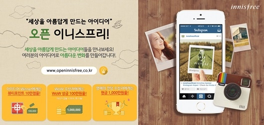 자연주의 화장품 브랜드 이니스프리는 3일 소셜기반 사진 공유 서비스 '인스타그램 공식 채널'과 고객 참여형 소통 플랫폼 '오픈 이니스프리'를 동시 론칭했다고 밝혔다.