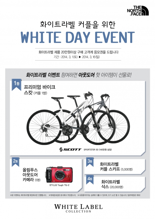 노스페이스는 '화이트라벨 커플을 위한 화이트데이 이벤트'를 연다. 16일까지 노스페이스 화이트라벨 매장에서 20만원 이상 구매한 고객에게 응모권을 증정하고, 추첨을 통해 1등 커플 한 쌍에게 프리미엄 바이크 스캇 자전거 2대를 선물로 준다.