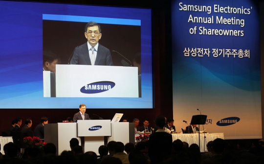 삼성전자는 14일 서울 서초사옥 다목적홀에서 주주, 기관투자자 등 400여 명이 참석한 가운데 제 45기 정기 주주총회를 개최했다. 권오현 삼성전자 부회장이 의장 인사를 하고 있다./삼성전자 제공