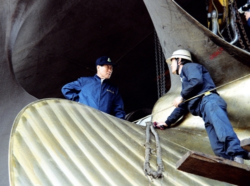 생전에 정주영 현대 창업자가 건조 중인 선박의 프로펠러 위에서 작업하는 직원을 격려하고 있는 모습./ 현대중공업 제공