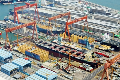 도크 내 선박 건조 작업이 한창인 현대중공업의 모습./ 현대중공업 제공