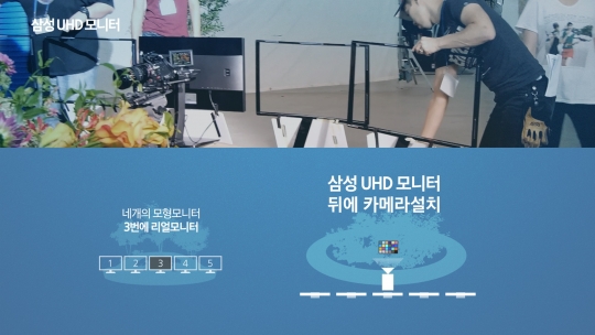 실험은 삼성 UHD모니터 뒤에 카메라를 설치, 카메라로 촬영되는 장면을 모니터로 투영하는 방식이다. 영상은 설치된 UHD모니터 1대와 베젤만 있는 모형 모니터 4대 중에서 어떤 모니터가 UHD모니터인지 테스터들이 선별하는 모습을 담았다.