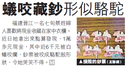 푸젠성 진장시에 사는 70세 노인 차이(蔡)씨는 1만 위안(약 165만 원)이 넘는 현금을 목재옷장 속에 숨겨놨다. 돈이 옆에 있어야 마음이 편했던 노인이 7~8년 전부터 돈을 보관해온 방법이었다. 최근 한 달 만에 다시 돈을 확인해본 노인은 당혹감을 감출 수 없었다. 흰개미 떼가 돈을 갉아 먹어버려 돈이 잔뜩 훼손됐기 때문이다.