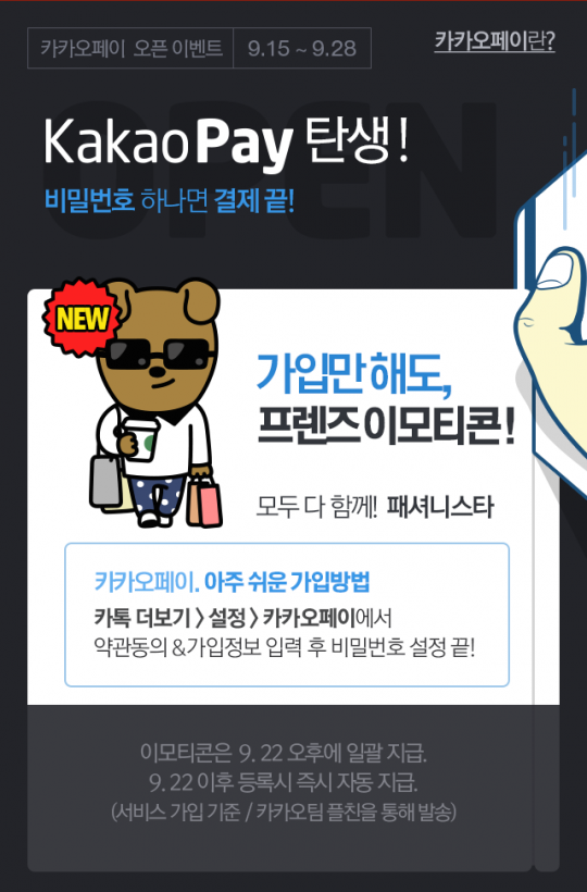 카카오는 카카오페이 출시 이벤트로 28일까지 서비스에 가입한 고객 전원에게 카카오톡에서 사용할 수 있는 'Hot! 9월 신상 프렌즈 패셔니스타' 이모티콘을 증정한다. 이모티콘은 카카오팀 플러스친구를 통해 지난 5일부터 21일 사이 가입한 이용자들에게 22일 오후 일괄 지급된다. 22일 이후부터는 가입 즉시 자동 지급된다.