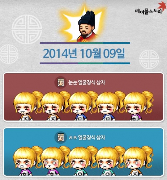 메이플스토리에서는 한글날 당일 하루 동안 게임 내 모든 피해 효과를 '일, 이, 삼, 사' 등의 한글로 표시하며 15일까지 '눈눈 얼굴장식 상자', 'ㅎㅎ 얼굴장식 상자' 등 '한글날 얼굴장식 상자'와 착용 시 한글 자음들이 따라다니는 '한글날 훈민정음 상의'를 판매한다.