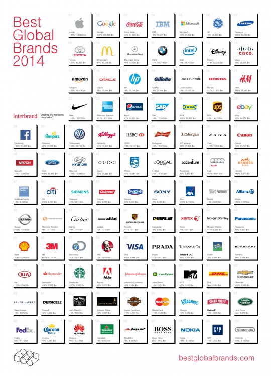 브랜드 컨설팅 그룹인 인터브랜드는 9일(뉴욕시간) 전세계 주요 브랜드의 가치 평가를 통해 상위 100개 기업을 선정하는 '2014년 베스트 글로벌 브랜드 (Best Global Brands 2014)'을 발표했다.