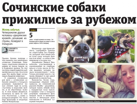 미국 스노보드 국가대표선수 린지 자코벨리스도 유기견 입양에 동참했다. 그는 "올림픽에서 메달은 따지 못했지만 훨씬 값진 보물을 발견했다"며 "강아지들과 함께 돌아와서 얼마나 행복한지 모른다"고 말했다. 그는 "소치에서 온 강아지들은 원래 키우던 치와와와 함께 산다"며 "때론 티격태격 하지만 모두 잘 지낸다"고 덧붙였다.