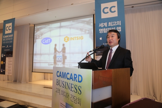 김선섭 씨아이디티 대표가 기업대상 명함 인식·관리 앱 '캠카드 비즈니스' 출시를 소개하고 있다. /씨아이디티