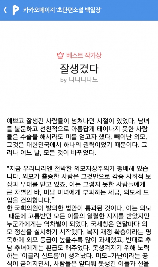 '초단편소설 백일장' 베스트 작품상으로 선정된 '잘생겼다' 작품 일부. 자세한 내용은 카카오페이지 소설 코너에서 확인할 수 있다.