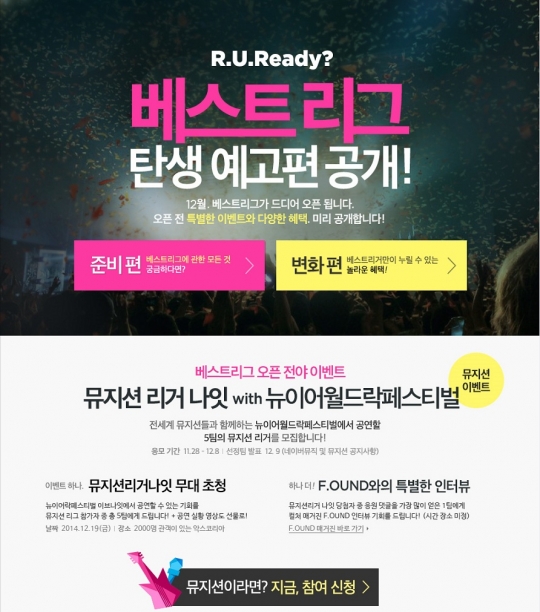 이번 공연은 연말에 선보일 '베스트리그' 사전 이벤트로 뮤지션리그의 뮤지션을 위한 첫 무대다. 관심 있는 뮤지션은 8일까지 이벤트 페이지에서 신청 할 수 있다. '뮤지션리거나잇'에서 만나고 싶은 뮤지션에게 응원 댓글을 남겨준 이용자는 추첨을 통해 공연 티켓을 받는다.