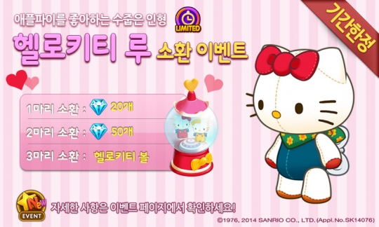 NHN엔터테인먼트 자회사 NHN스튜디오629는 산리오의 헬로키티 IP 협업에 따라 5일 '우파루마운틴 for Kakao'에 신규 우파루 '헬로키티 루'와 헬로키티 장식물 5종을 선보였다.