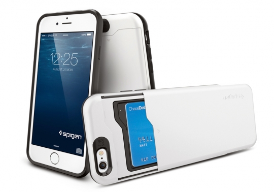 슈피겐의 아이폰6, 아이폰6플러스 '슬림아머 카드슬라이더'는 자주 사용하는 신용카드나 버스카드를 최대 2장까지 내부에 보관할 수 있는 케이스다. 케이스를 벗겨 카드를 수납하는 대다수의 제품과는 달리 '슬림아머 카드슬라이더'는 후면 슬라이드 커버를 아래로 내려만 주면 카드를 쉽게 넣고 꺼낼 수 있어 사용이 매우 편리하다.