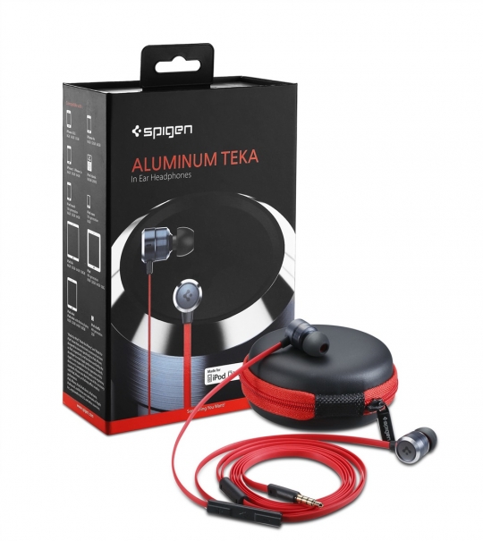 슈피겐의 '알루미늄 테카'는 MFi 인증을 받아 애플제품에 완벽히 호환되는 이어폰으로 기본적인 음악조작은 물론 전화 수신까지 가능한 iOS특화 인라인 리모컨이 내장돼 있는 것이 특징이다. 금속 특유의 광택 및 질감을 살린 고급스런 디자인과 강렬한 레드와 블랙의 조화로 애플기기와 완벽한 매칭을 이루는 점도 돋보인다.