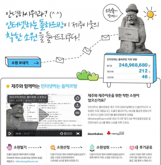 다음카카오가 제주 지역사회와 함께하는 사회공헌 프로그램 '인터넷하는돌하르방' 2015년 1분기 사업을 공모한다.
