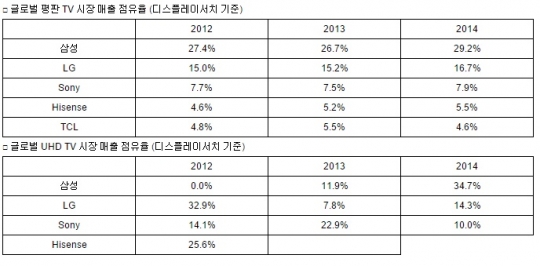 또 최근 TV 시장의 대세로 자리매김하고 있는 UHD TV 시장에서도 비약적인 판매량 신장을 기록하며, 2013년 11.9%에서 20%p 넘게 상승한 34.7%의 점유율로 정상에 섰다.