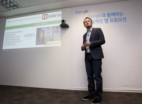 26일 열린 구글코리아 기자간담회에서 조너선 알퍼니스 구글 글로벌 모바일 광고 제품 총괄이 우리나라의 구글 광고 활용 우수 개발사를 소개하고 있다. /구글코리아