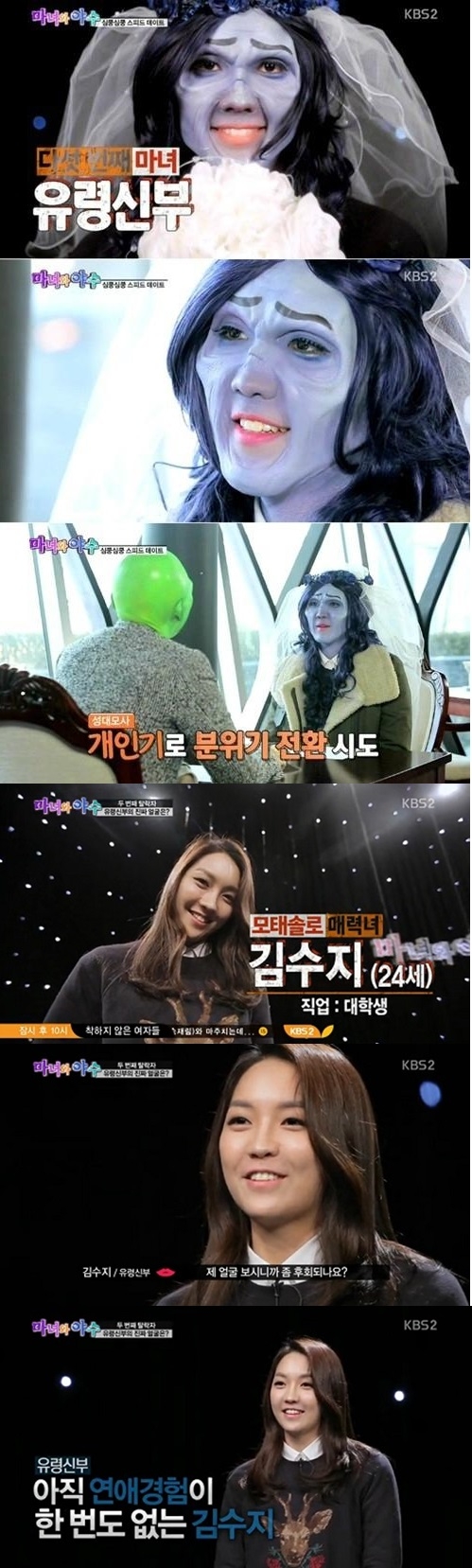 이날 방송에서 야수는 마스크 분장을 하고 여섯 명의 마녀들과 데이트를 진행했다. 유령신부로 출연한 여대생 김수지는 다섯 번째 마녀로 출연했다.