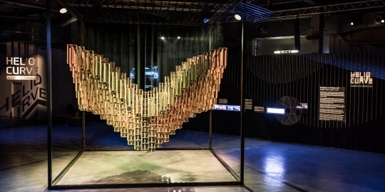 현대차가 선보인 '헬리오 커브'는 가상의 움직임에 생명을 불어넣는 움직임을 표현한 작품으로 높이 5미터, 길이 26미터의 전시공간 전체를 아우르는 대형 전시물로 하나하나 수작업으로 만들어진 400개의 나무블록들이 선으로 연결 되 양쪽 구동축의 움직임을 통해 3미터 높이의 파도가 치는 듯한 거대한 자연의 움직임을 그려냈다.