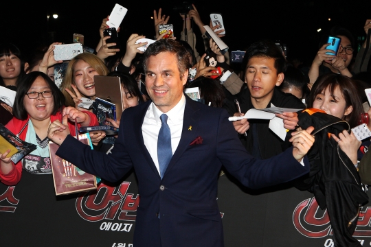 17일 저녁 서울 대치동 서울무역전시장(SETEC)에서 열린 영화 '어벤져스: 에이지 오브 울트론' 레드카펫 행사에서 배우 마크 러팔로가 팬들의 환영에 기쁜 표정으로 화답하고 있다./손진영 기자 son@