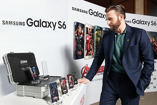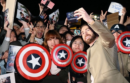 17일 서울 대치동 서울무역전시장(SETEC)에서 열린 '어벤져스:에이지 오브 울트론' 레드카펫 행사에서 크리스 에반스가 국내 팬들과 함께 '갤럭시 S6'로 셀피를 촬영하고 있다. / 삼성전자 제공